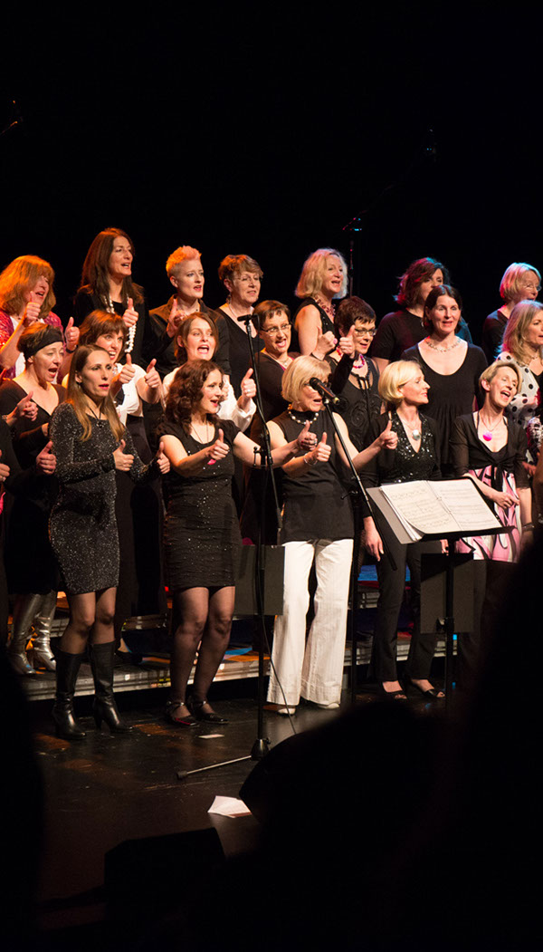 Dieses Motto begleitet uns Frauen nun schon seit vielen Jahren. Angefangen hat es mit uns 1995 im Eltern-Kind-Zentrum (EKiZ) im Stuttgarter Westen, wo sich Mütter mit ihren Kindern zum gemeinsamen Singen trafen. Die Kinder wurden größer und plötzlich gab es für uns Mütter keinen Vorwand mehr, sich beim Kindersingen zu treffen und auszutauschen. Da wurde die Idee eines eigenen Chores - ohne Windeldunst, ohne Vorsänger und vor allem abends ohne Kinder - geboren.